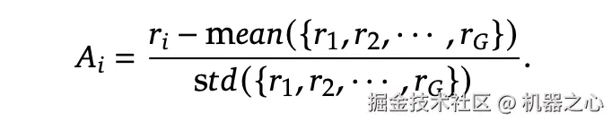 其中,优势值 A_i 通过标准化每个输出的奖励来计算: