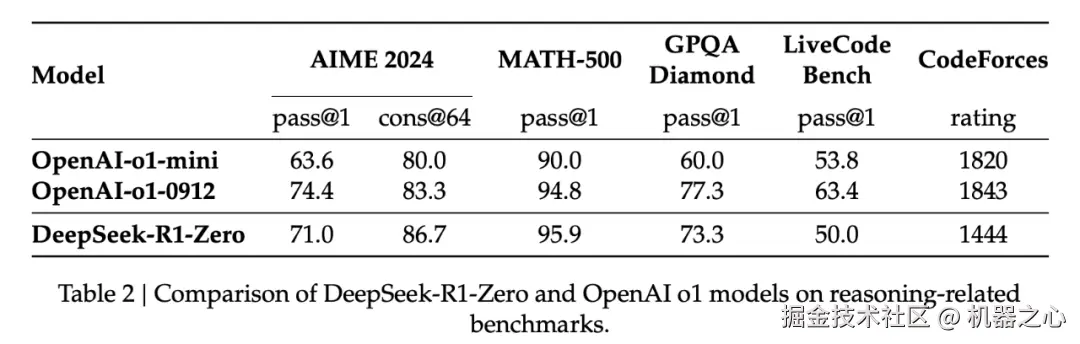 DeepSeek-R1-Zero 与 OpenAI 的 o1-0912 在多个推理相关基准测试上的得分对比。