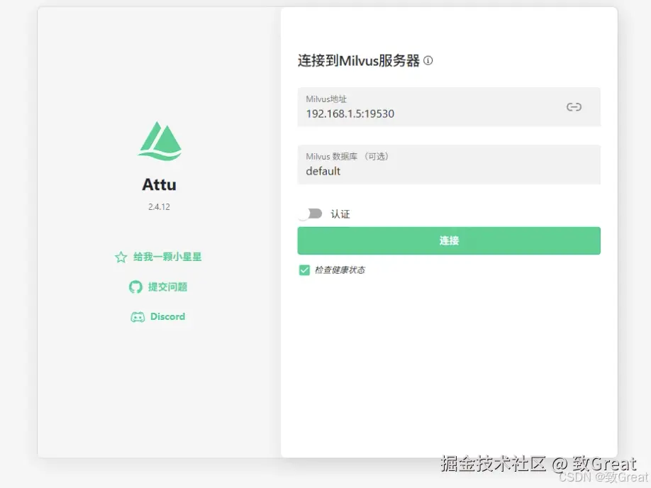 请注意,MILVUS_URL 地址必须是 Attu Docker 容器可以访问的地址。因此,“127.0.0.1”或“localhost”不起作用。