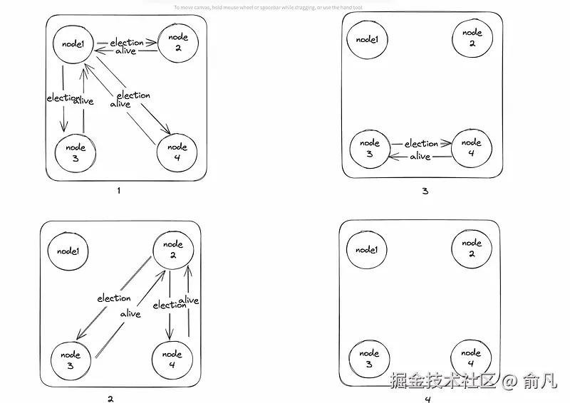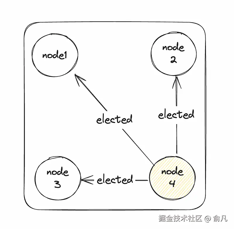 node4成为领导者,因为根据其 ID,它的排序最高。在没有领导者的情况下,node4发起选举,宣布自己为领导者,并广播 ELECTED 消息通知其他节点。