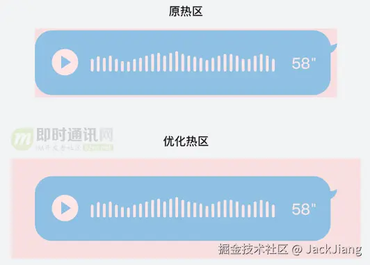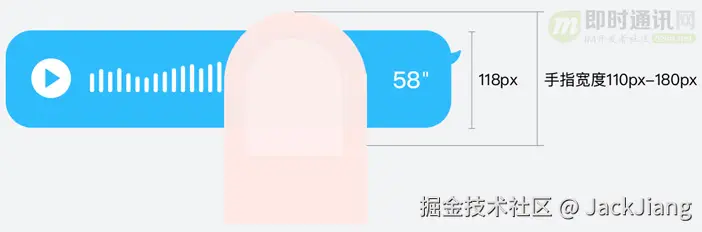 畅快意味着无拘无束,翻译成交互语言就是要赋予用户更大的操作区域。但是我们的手指宽度和控件大小有时难以匹配。例如,8.0UI改版后的语音气泡高度为118px,而成人手指的宽度范围则在110px-180px。如果拖拽只能在气泡范围内进行,就意味着用户需小心翼翼地去操作。为了实现“无拘无束”的拖拽体验,我们根据用户的行为阶段对响应范围进行了两次放大。
