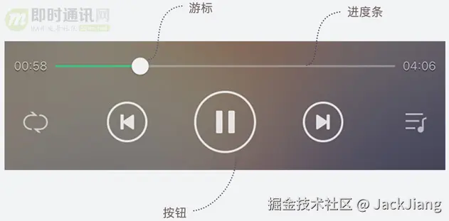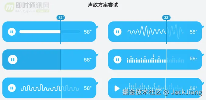 暂停和拖动在语音中不常见,但它却是播放器的通用功能。在播放器设计中,有三个用户行为引导的关键元素:a.按钮—播放和暂停的指示 b.游标—拖动指示 c.颜色—进度指示。本次语音气泡的设计中,我们依旧沿用了按钮、游标、色彩作为指示性元素。