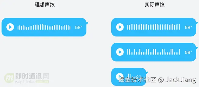 但是这些元素的加入无疑会加重气泡内的信息负担。并且当同时出现多个语音气泡时,我们更加需要保证聊天页面有适当的信息密度。因此在声纹样式设计中,降噪成为了关键。在发散了多种样式后,我们最终选择了这种简约的声纹形态。它既能很好的展示进度信息,又可以平衡气泡内的信息密度,让QQ多样化的用户群都能对语音进度拖拽有更直觉化的操作。