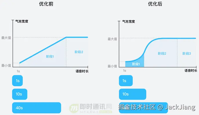- [阶段1] 斜率逐渐增加的曲线。此阶段对应着短时长语音,也是用户的高频使用场景。因此该阶段气泡长度随语音时长的增长需要更加明显;