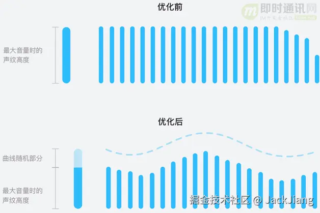 在收集了大量用户真实语音声纹后,我们发现最“丑”声纹来自于两类声音。一类是当用户语音连续达到最大音量时,大量声纹达到最高高度并撑满语音气泡。这种现象常发生在用户对着手机收音孔处说话的场景中。为了解决这个问题,我们将达到最大音量的声纹高度进行削减。被削减的高度按照正弦曲线做随机值,再加回到这些声纹的上方。经过这样的优化后,所有达到最高值的声纹都能够在顶部产生流畅的曲线。