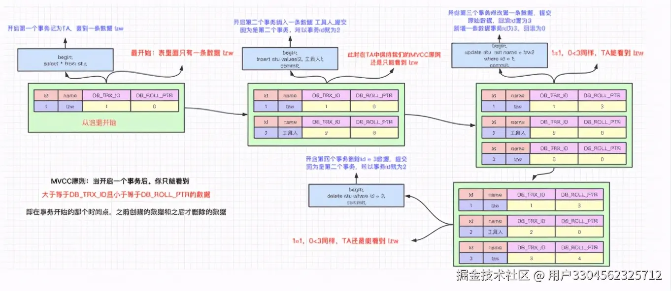 避免脏读:脏读是指一个事务读取到了另一个未提交事务修改的数据。在 MVCC 机制下,当一个事务读取数据时,会根据 Read View 判断数据的可见性。如果数据行的 trx_id 对应的事务处于活跃状态(未提交),那么该行数据对当前事务不可见。只有当数据行的 trx_id 对应的事务已经提交,该行数据才对当前事务可见。因此,MVCC 有效地避免了脏读的发生。