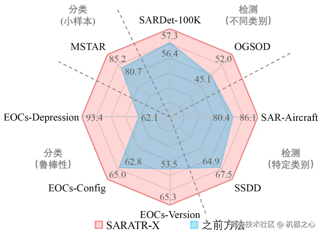 生态层面,由于 SAR 图像数据敏感性、标注代价昂贵等因素,缺乏良好的、开源的代码、评估基准和数据生态,导致很多 SAR 目标识别算法不开源、算法评估基准不统一、目前尚无公开的百万 / 千万级大规模高质量 SAR 目标识别基准数据集等问题。