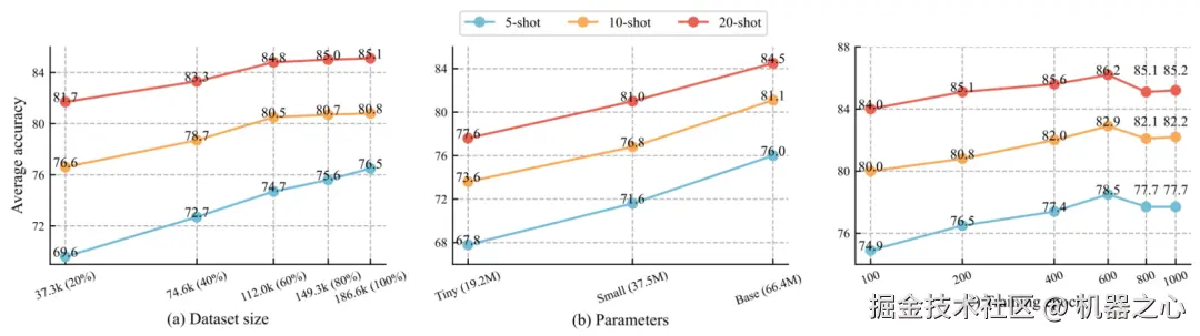 图 6. SARATR-X 在数据集大小、模型参数量和训练轮数方面的可扩展性。虽然方法受益于这三个方面,但需要注意的是,由于数据集的大小,过大的训练轮数经常会导致过拟合。
