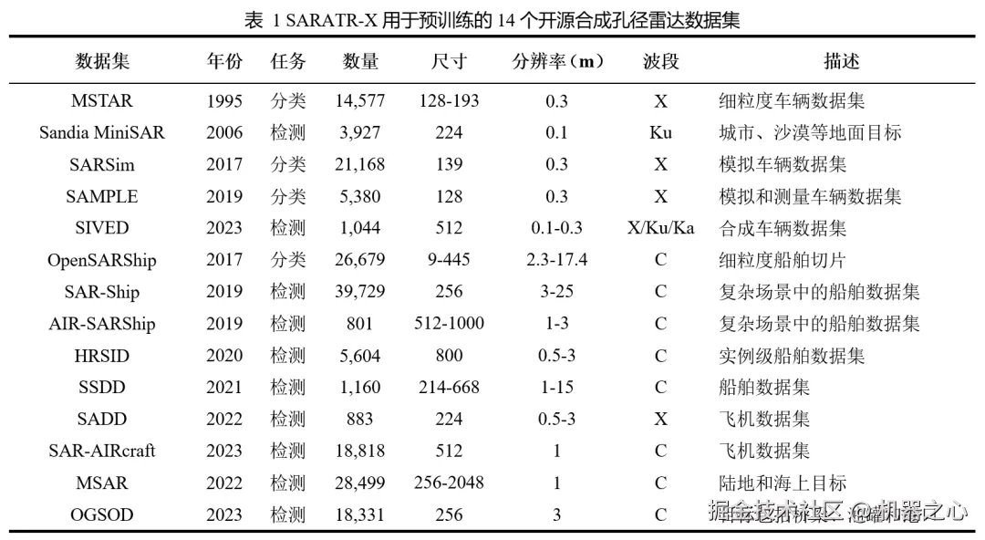 表 1._ SARATR-X 用于预训练的 14 个开源合成孔径雷达数据集。_