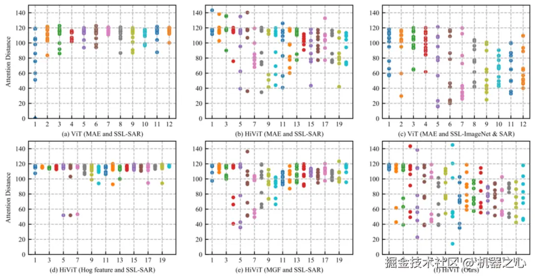 注意力多样性分析,对于不同模型的注意力范围进行可视化分析,如图 5 所示,通过模型架构(图 a v.s. 图 b),初始化权值(图 a v.s. 图 c)和 SSL (图 d v.s. 图 e)改进以确保 SAR 目标识别的注意范围不同,包括 HiViT 架构、ImageNet 权重和 SAR 目标特征。
