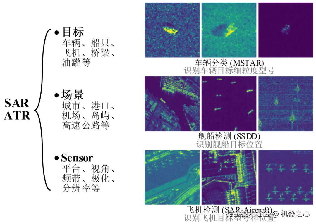 图 1. 各种专门的 SAR ATR 数据集和任务。SAR ATR 包括各种成像条件(即操作条件),如目标、场景和传感器。然而,由于成本较高,通常是在特定任务和设置中收集数据集。例如,MSTAR 是 X 波段和草地场景中的 10 型车辆目标分类数据集,SAR-Aircraft 是从三个机场和 C 波段卫星收集的 7 型飞机检测数据集。不同的目标特征、场景信息和传感器参数使现有算法的泛化困难。因此,团队旨在建立 SAR ATR 基础模型,一种用于各种任务的通用方法。