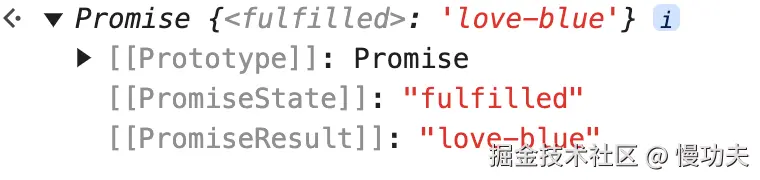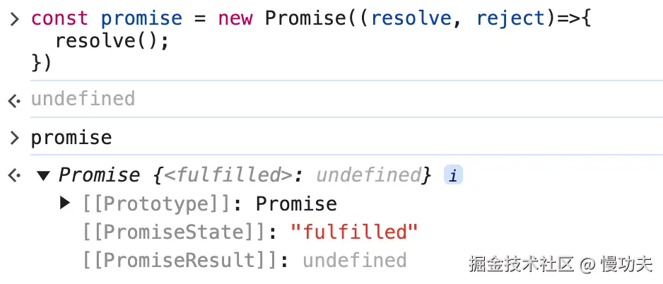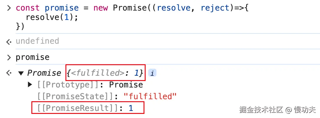 可以很清楚的看到,当我们调用 resolve 或者 reject 之后,promise 的状态发生了变化。调用 resolve 参数会将 promise 的状态变成 fulfilled, 或者调用 reject 参数会将 promise 的状态的变成 rejected