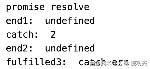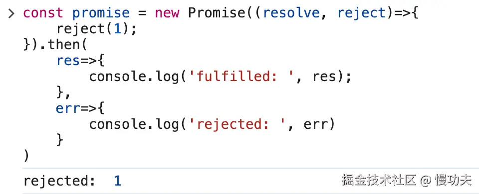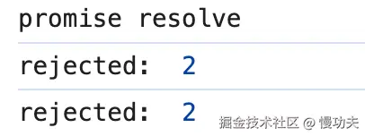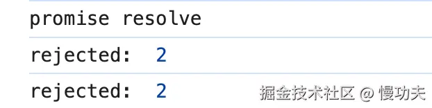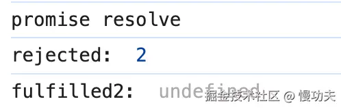 第一行打印结果意料之中。第二行打印结果是rejected:2,是因为上一个 promise 的状态是 rejected,所以 then 中的第二个回调函数被执行;并且失败的值是 2, 所以 err 的值为 2