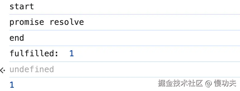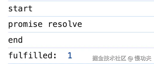 promise resolve在 start 和 end 中间打印出来,Promise 构造函数的代码是同步代码。而fulfilled:1在 end 后面调用,所以 then 里面的代码是异步代码!