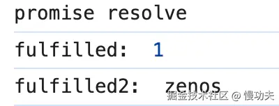 打印结果第三行是fulfilled2: zenos,是因为第一个 then 返回了一个普通值zenos,所以其返回的新 promise 的状态为 fulfilled,并且值为 zenos