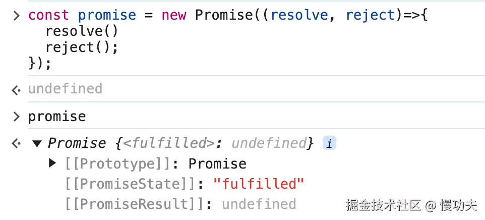 我们还可以尝试,在调用了 resolve()之后,再调用 reject()会发生什么?