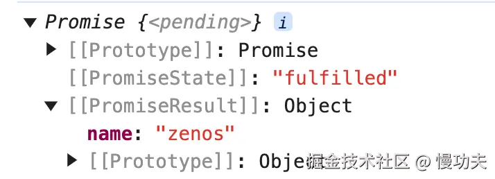 promise 对象,包括其原型对象中并没有类似 value,或者 getValue 属性,让我们获取其中的值,所以这条路是行不通的,得通过 then 函数: