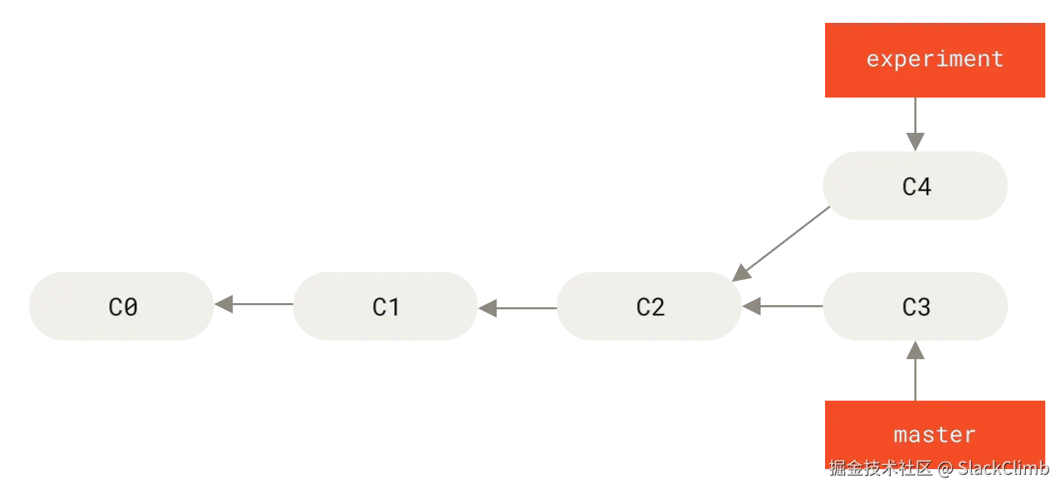 experiment分支和master分支的共同祖先提交,此例中为C2,因为experiment分支从C2处分叉。 - 保存提交序列:Git 把