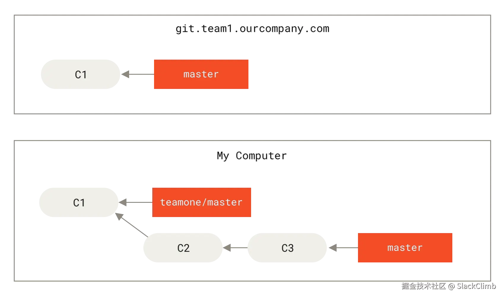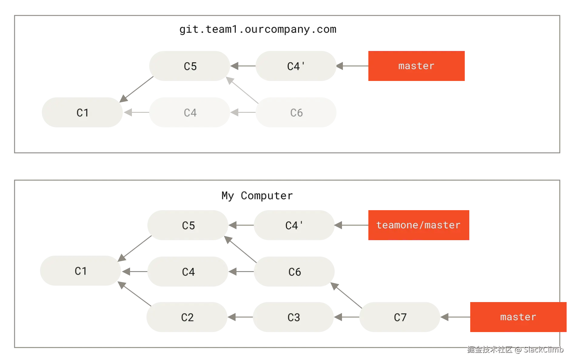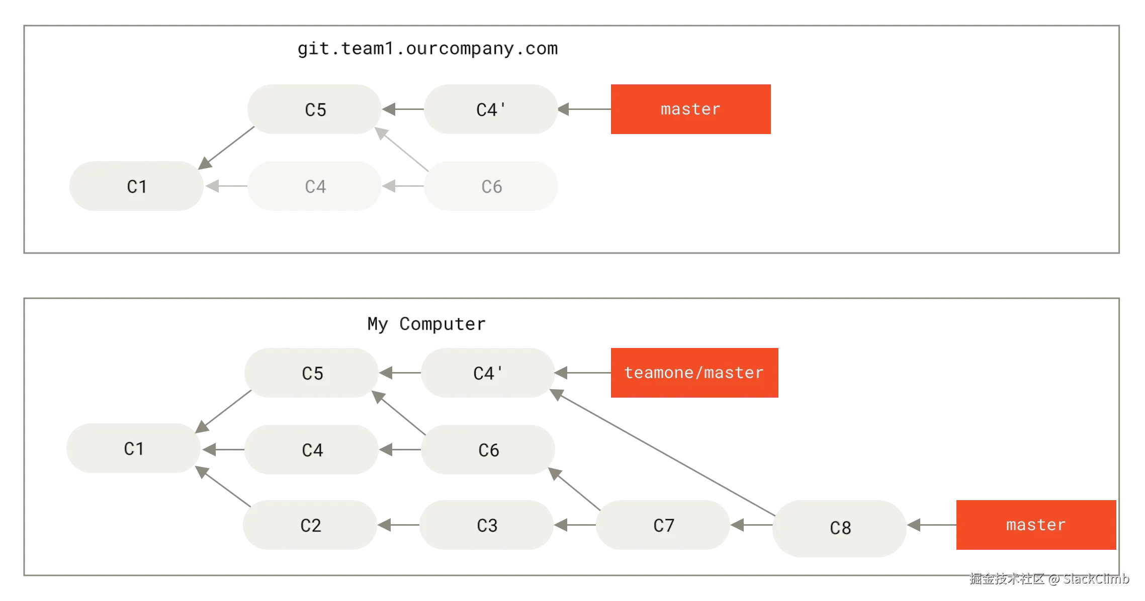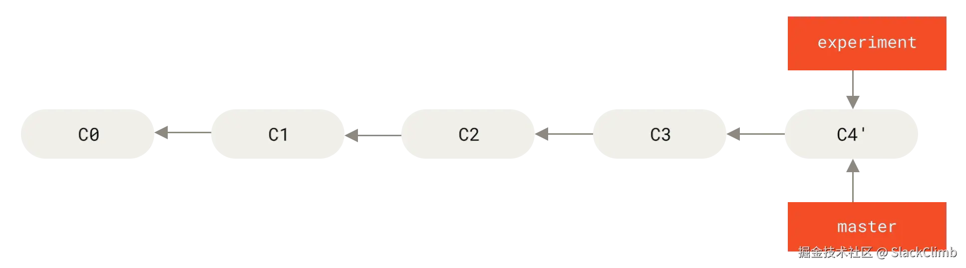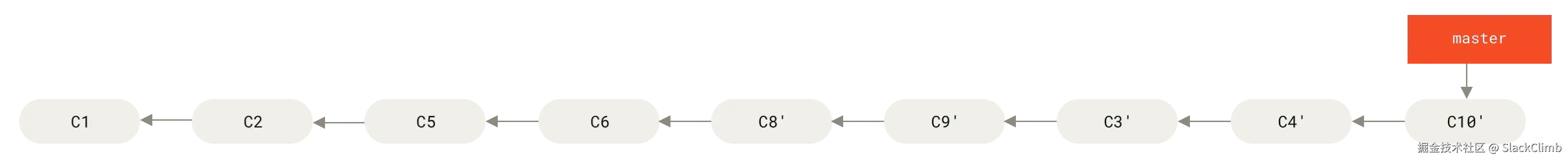 C4重新应用到新基础C3上。通过模拟C4在C3基础上的变更效果,Git 创建一个新的提交对象C4'。由于C4'的父提交是C3(而原C4的父提交是C2),尽管功能效果与C4相同,但它是一个全新的提交,拥有不同的哈希值。 - 过程图: