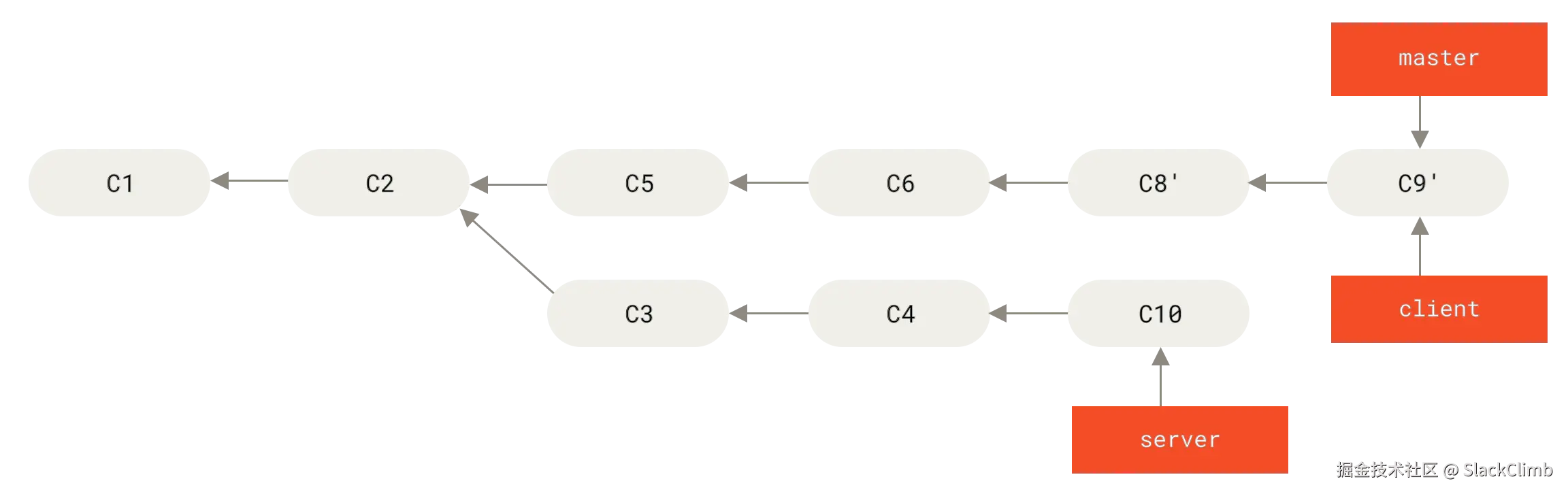 git rebas命令的--onto选项,选中在client分支里但不在server分支里的修改(即C8和C9),将它们在master分支重放:git rebase --onto master server client -