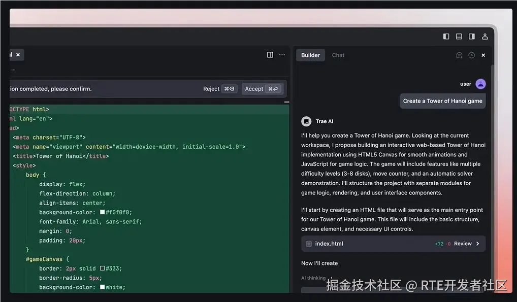 值得注意的是,Trae 还具备一个强大的 Builder 功能,能够根据用户需求生成完整的代码项目。然而,用户在项目开发过程中仍需手动确认 AI 生成的代码,确保代码的完整性和准确性。这一过程或许略显繁琐,但也为用户提供了更大的控制权。