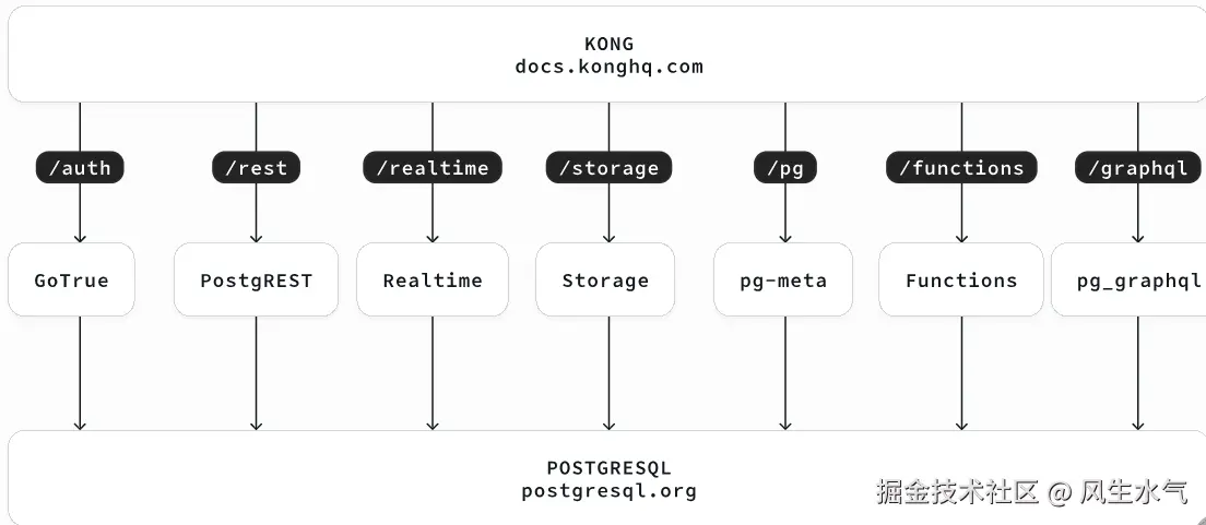 Supabase的架构主要围绕 PostgreSQL 数据库,并结合了其他开源工具,提供了一套完整的功能。关于架构的更多详情参考官方文档,这里列出其主要架构: