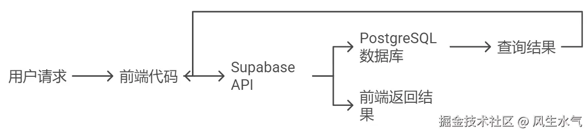 前端代码调用 Supabase JavaScript 客户端库,发送请求到 Supabase 的 API。