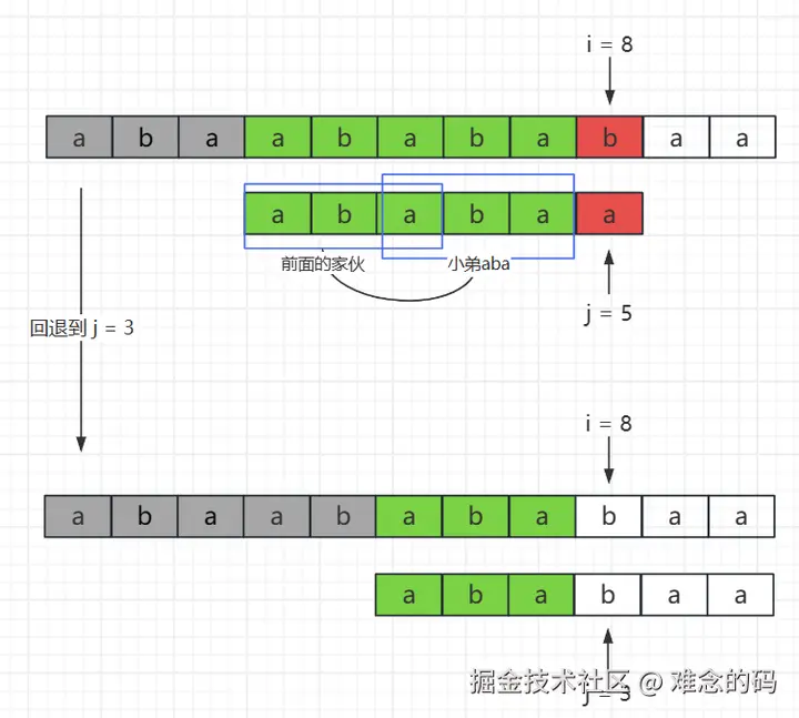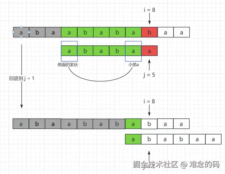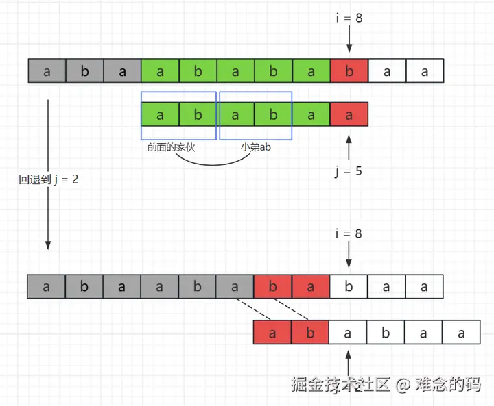其实小弟不是有意的,问题出在这个小弟 ab 自身上,小弟 ab 和匹配失败的位置 j = 5 没有紧邻啊,这是必须的,不然位置对不齐。从图里应该很直观的看到吧,回退到 j = 2 后,“前面的家伙 ab”和“小弟 ab”错位了。