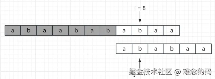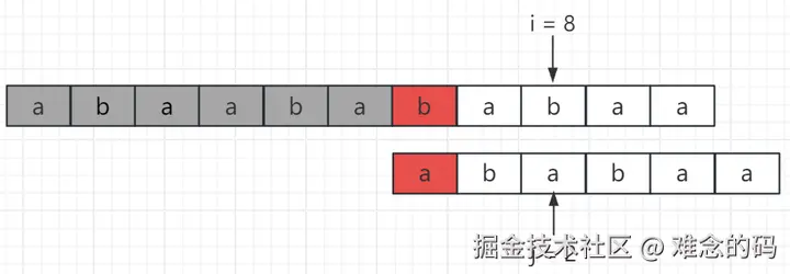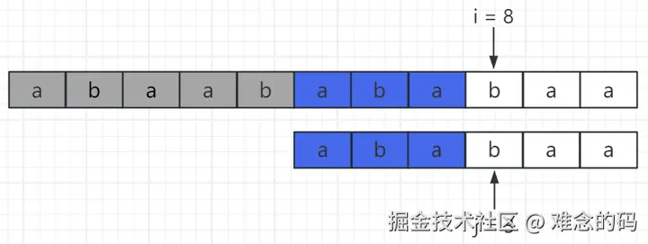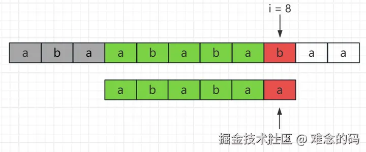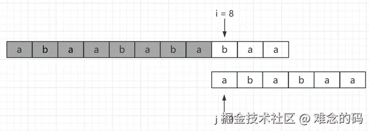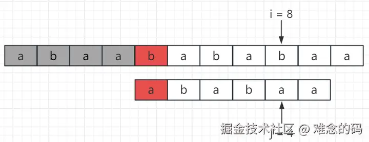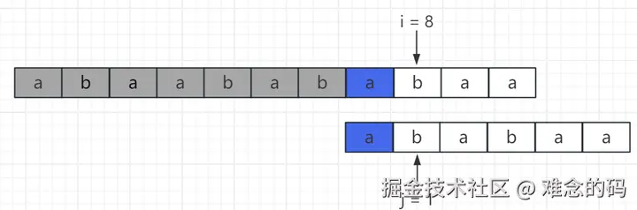 此时 i = 8, j = 0,b !=a,通过比较,我们能确定从 i = 8 开始的主串无法和模式串匹配成功。