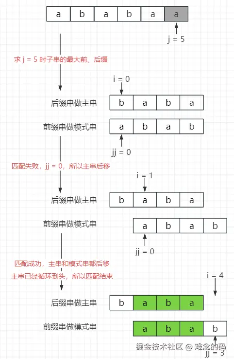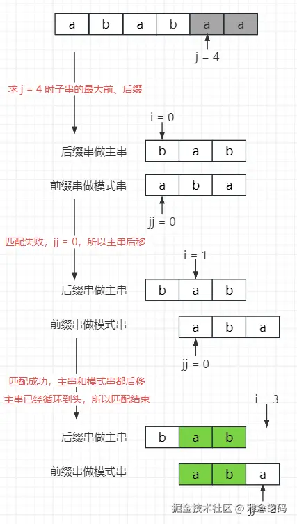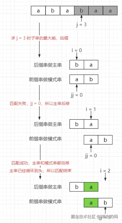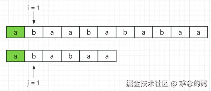 第二轮从 i = 1,j = 0 开始,b != a,此时就宣告这一轮失败了,头都对不上,尾就没必要看了。