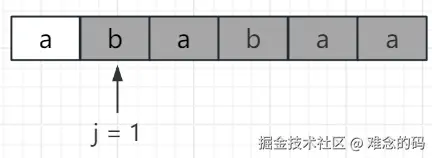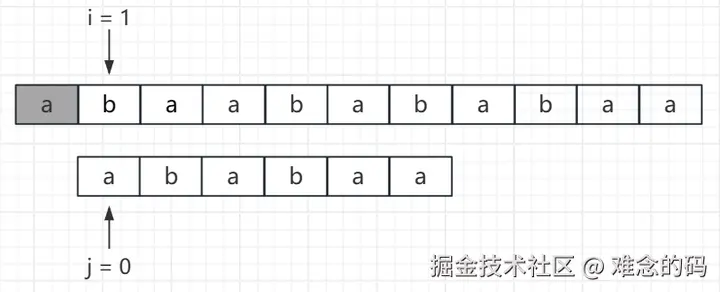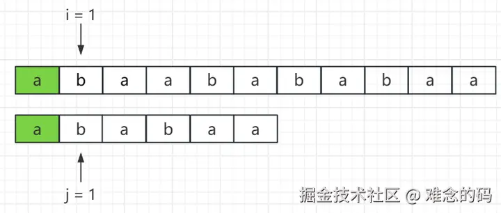 当第一个字符匹配成功后,j 后移一位。此时 j = 1,已经匹配成功了一个字符。