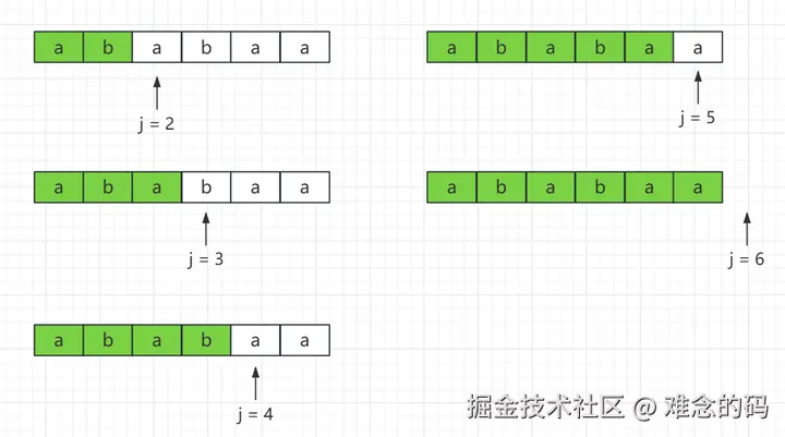 j = 5 之前子字符串的最长前缀为 abab,最长后缀为 baba。直接用它们做匹配,最后发现能匹配上三个字符,所以 next[5] = 3;