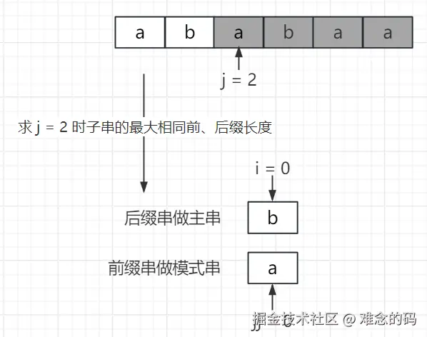 j = 2 之前子字符串的前缀只有 a,后缀为 b,匹配失败所以 next[2] = 0。(前缀串做模式串时的下标用 jj,为了与 j 区分。)