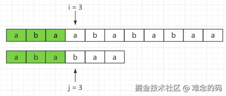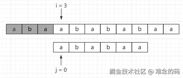 现在要匹配 i = 3,j = 3 上的字符了,很显然 a != b,匹配失败。