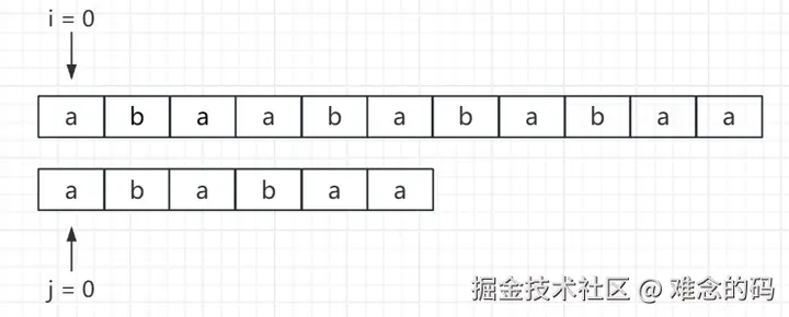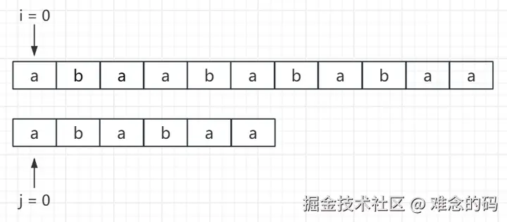 在开始匹配的初始状态,主串的下标 i = 0,模式串的下标 j = 0,从头开始,目前没有一个字符进行过匹配。