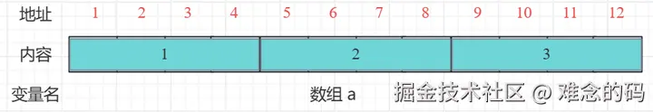 一个整形数组 int a[3] = {1, 2, 3},假设从地址为 1 的位置开始存储,占有 12 个字节的存储空间,在内存上的空间如下图所示。我们不难发现数组 a 的首地址和和 a[0] 的首地址都是地址 1。