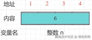 一个整形变量 int n = 6,假设从地址为 1 的位置开始存储,在内存上的空间如下图所示,占有 4 个字节的存储空间。