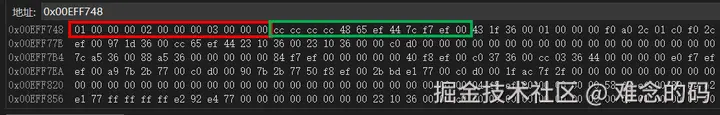 &a 执行 +1 后,指向的地址直接移动了一个数组的空间。如图,红框部分为数组 a[3],&a + 1 对应的是绿框部分的首地址。这与 a + 1 只是移动一个 int 的大小有很大的区别。