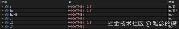 a 的类型是 int[3],跟我们的认知一样。第二列“值”,a 的值是 0x00eff748,是一个地址,从该地址解读出来的内容是 {1, 2, 3},a 的工作方式显然是间接取值,类似于指针,那么 a 类似于一个什么类型的指针呢?