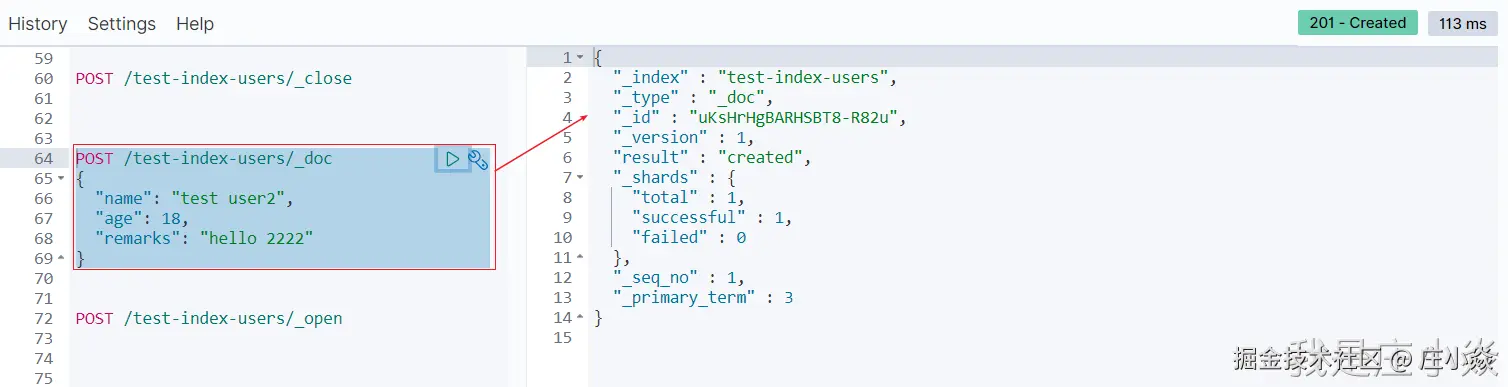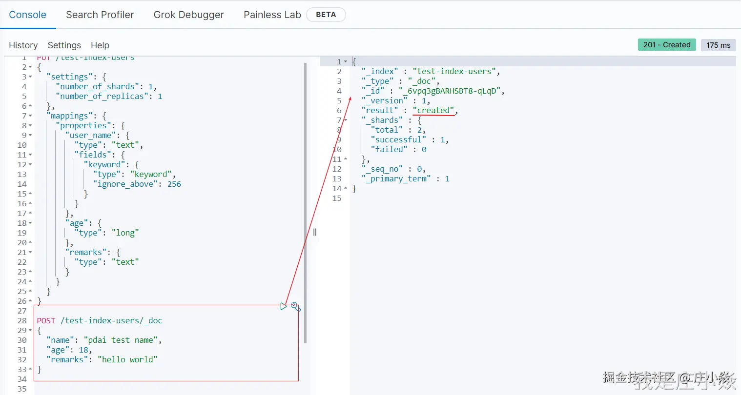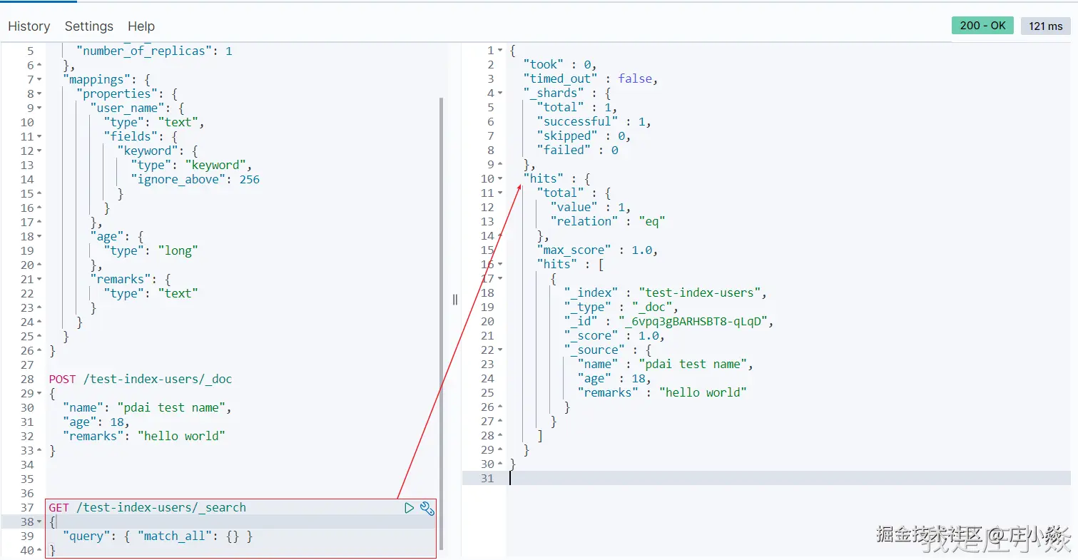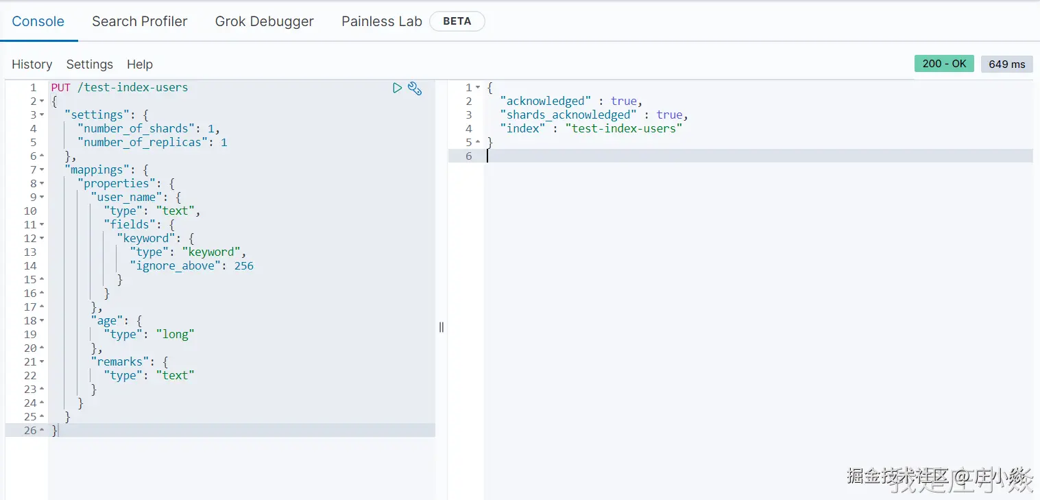 我们创建一个user 索引test-index-users,其中包含三个属性:name,age, remarks; 存储在一个分片一个副本上。