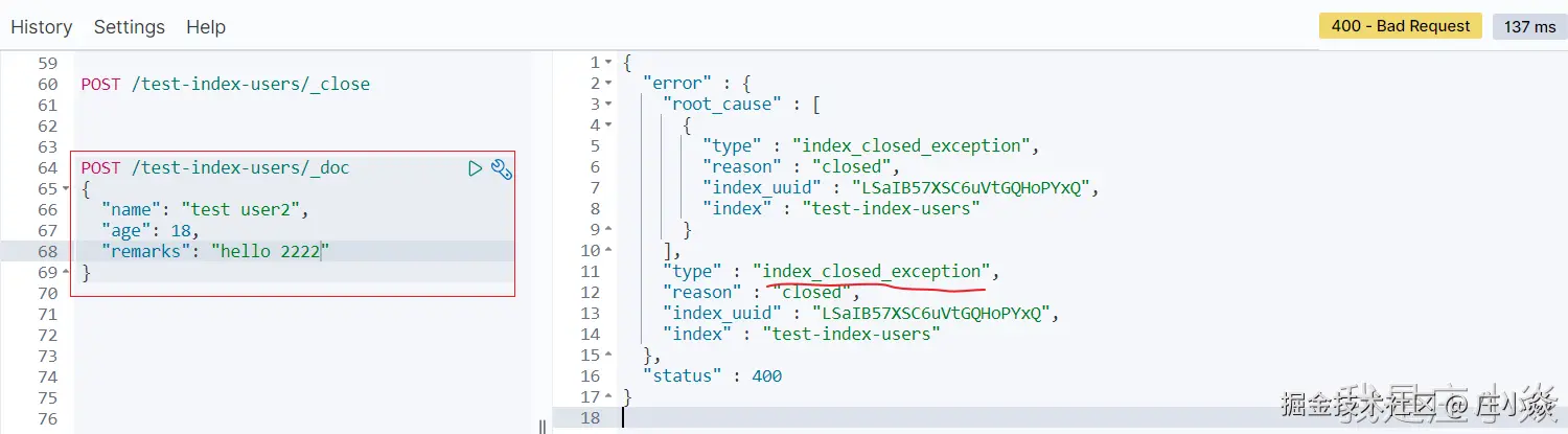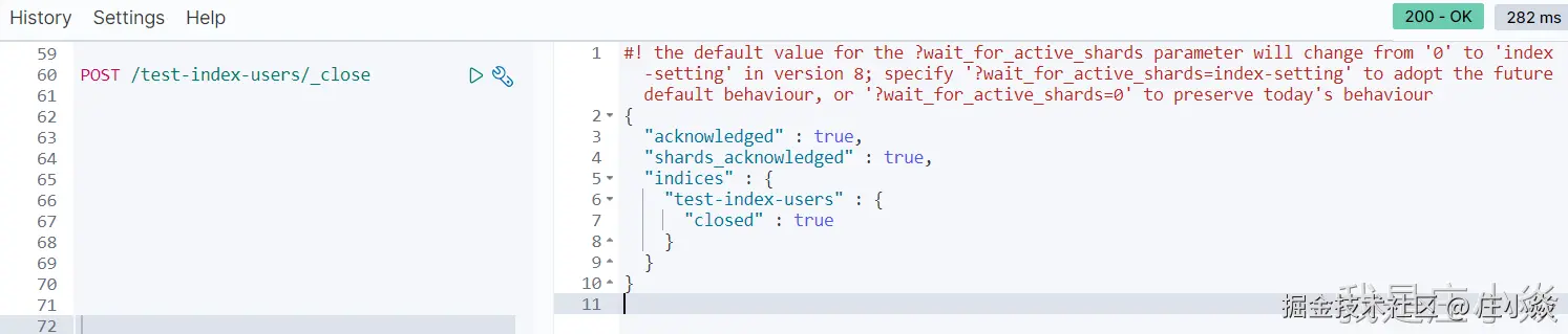 关闭索引: 一旦索引被关闭,那么这个索引只能显示元数据信息,不能够进行读写操作。