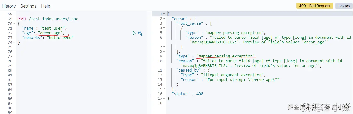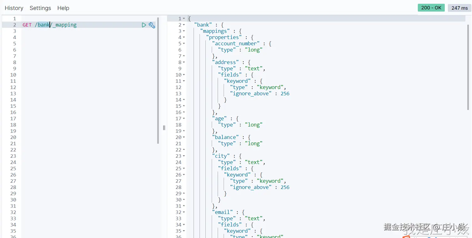 而这个index实际上已经自动创建了它里面的字段(name)的类型。我们不妨看下它自动创建mapping:
