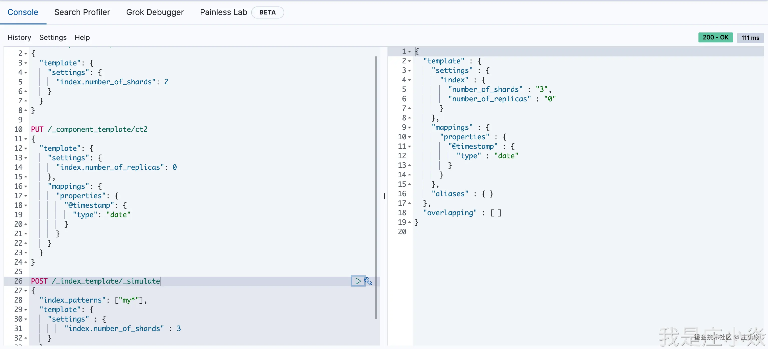 由于模板不仅可以由多个组件模板组成,还可以由索引模板自身组成;那么最终的索引设置将是什么呢?ElasticSearch设计者考虑到这个,提供了API进行模拟组合后的模板的配置。