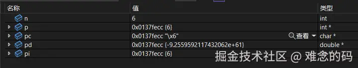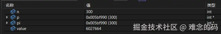 指针 p 是通过取址运算获得了 n 的地址。随后我们把 int* 类型强制转换成 int 型并赋值给变量 value,下图里的 value = 0x005BF990 = 6027664,也就是直接把 16 进制表示的地址换算成了 10 进制的数字;最后再把 int 型的 value 转换成 int* 类型,赋值给 pi,这时通过 pi 也是可以获得正确的 n 的值。