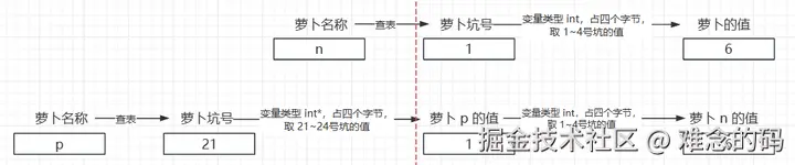 指针也是一个变量,所以肯定要先经历第 2 节的两个步骤,从萝卜名称找到萝卜值。p 这个萝卜的值是 1,而且这个值是一个地址,所以还没完,我们接着去编号 1 的这个地址找,因为 p 指向的类型是 int,所以从 1 号开始取四个坑,在坑 1~4 中的值就是变量 n 的值了。