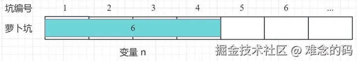 指针也是变量,要认识指针,难免要先学习一下变量。假设有下面的语句,定义了 int 型变量 n,在 32 位机器上它占 4 个字节,也就是 4 个萝卜坑,我们现在把这个变量放到萝卜坑 1~4 里去。