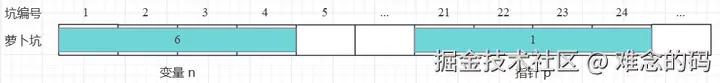 32 位机器上指针的大小是 4 字节,后续会展开讨论。我们假定指针变量占着的 4 个坑位是 21~24 号,那么整个内存情况如下图所示。