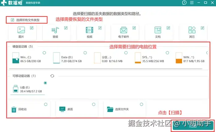 步骤1: 打开这款软件,在软件的首页上选择需要恢复的数据类型(可以选择勾选【选择所有文件类型】),和选择电脑扫描的位置,然后启动软件开始扫描。