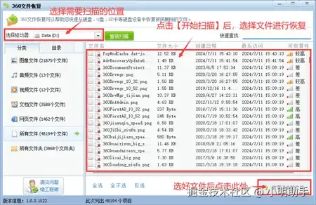 操作指导: 打开软件,根据【功能大全→数据→文件恢复】找到开启工具的入口;在左上角选择扫描位置,点击【开始扫描】,最后在指定位置上选择自己需要恢复的文件,点击【恢复选定的文件】。