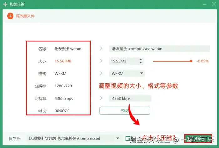 步骤3:根据视频压缩界面提供的选项,调整视频的大小、格式等参数,然后点击【压缩】即可。